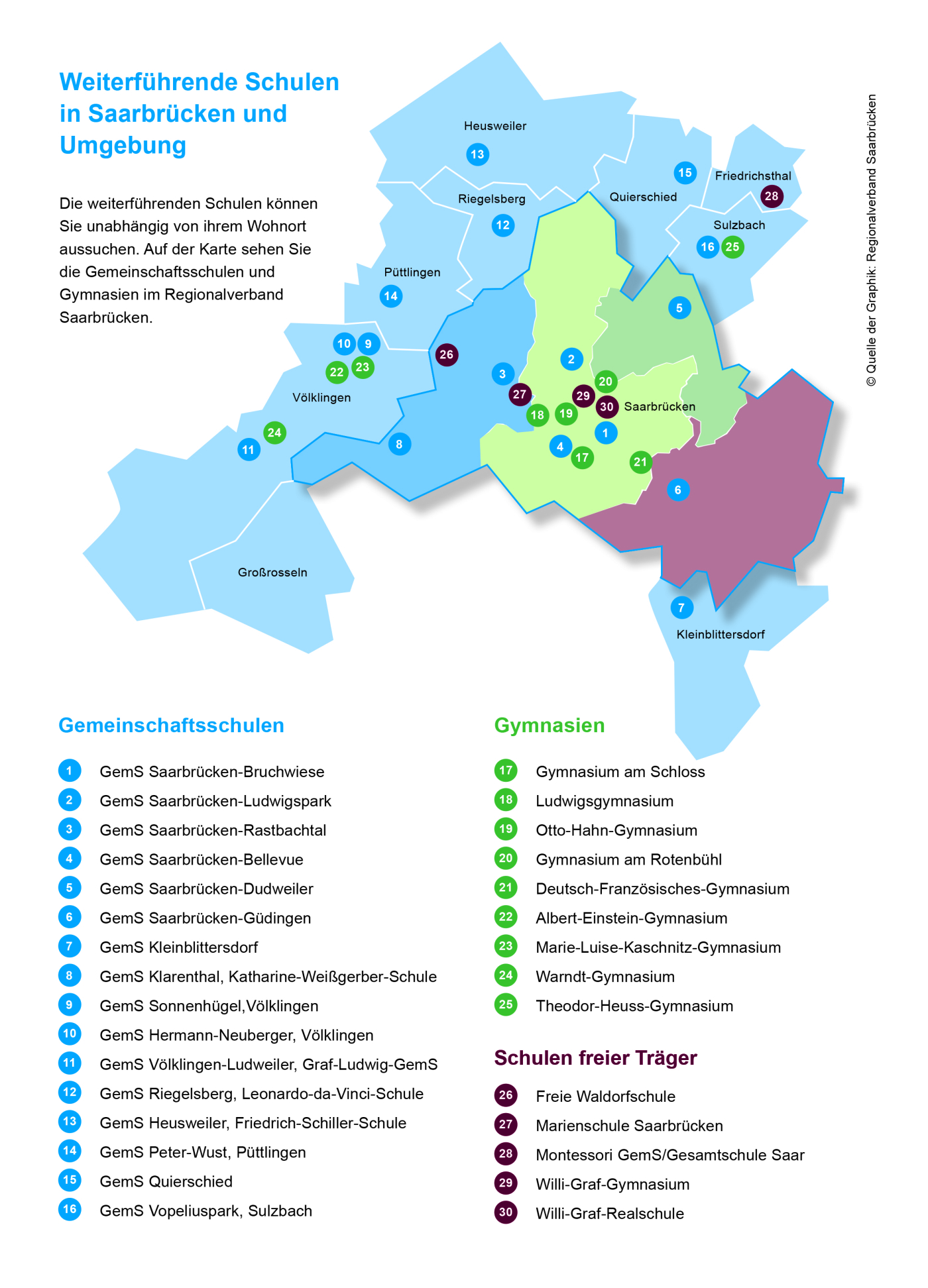 Die Grundschule dauert vier Jahre. Danach gehen die Kinder auf eine weiterführende Schule. Im Saarland gibt es zwei Möglichkeiten: die Gemeinschaftsschule oder das Gymnasium.