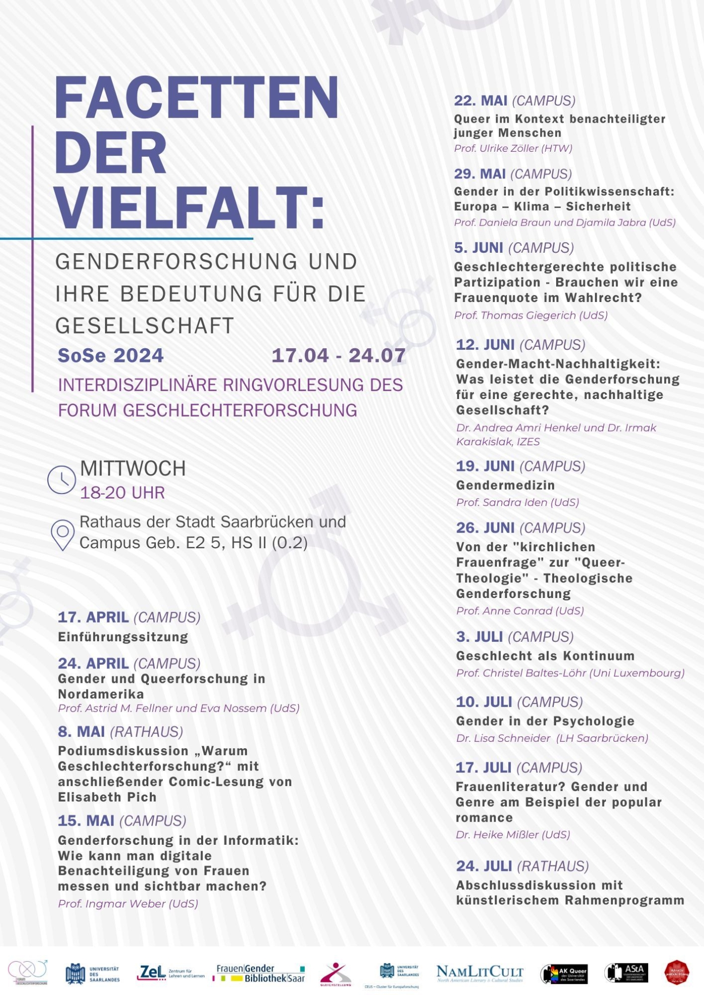 Die öffentlichen Vorträge finden immer dienstags um 17.15 Uhr auf dem Saarbrücker Campus im neuen Chemie-Hörsaalgebäude statt (Gebäude C4 3, kleiner Hörsaal II). Die Vorträge können teilweise online mitverfolgt werden.