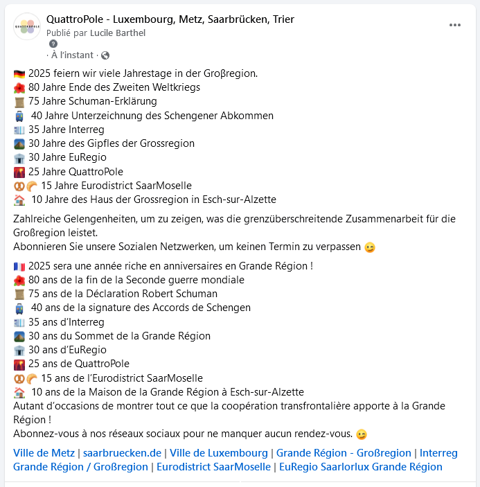 Im Jahr 2025 feierte QuattroPole seinen Geburtstag nicht allein: Auch die Strukturen des Hauses der Großregion wollten daran erinnern, dass dieses Jahr von zahlreichen Jubiläen geprägt war.