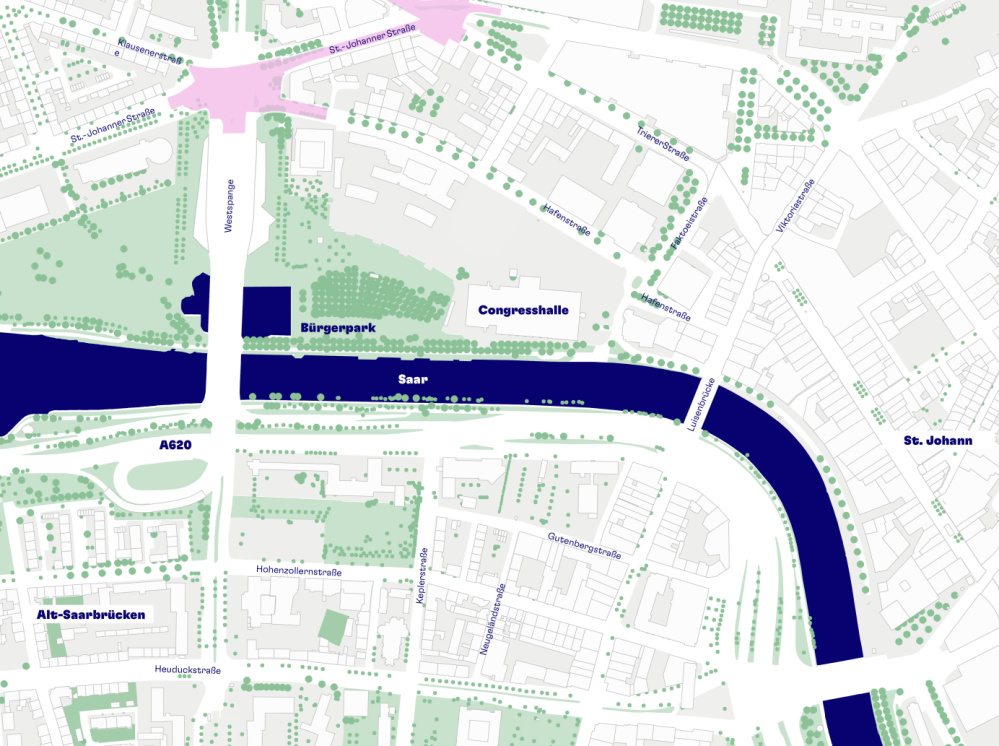 Im Bereich des neuen Kreisverkehres sowie in dem Umbau betroffenen Abschnitt der St. Johanner Straße bis in die Trierer Straße sind Baumpflanzungen vorgesehen.