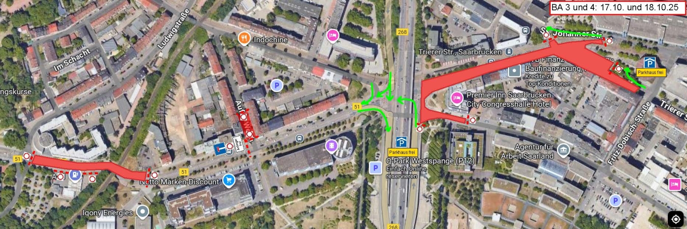 • Weiterhin Sperrung der St. Johanner Straße von Hausnummer 102 bis 110 (weiterhin keine Durchfahrt nach Burbach/Malstatt).
