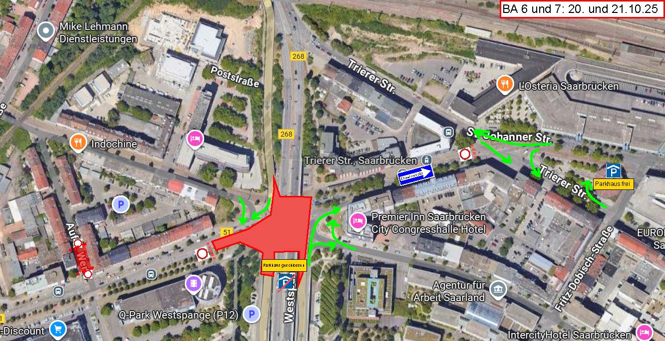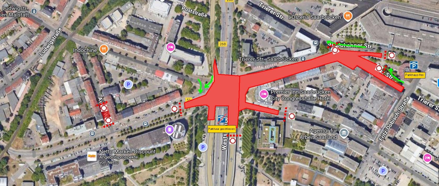 • Einfahrt in die Hafenstraße von der Westspange und aus Burbach kommend gesperrt. → Der Bereich zwischen Hafenstraße, Trierer Straße und Faktoreistraße ist nur über die Viktoriastraße erreichbar und kann über die Viktoriastraße oder die St. Johanner Straße/Trierer Straße in Richtung Ludwigskreisel verlassen werden.