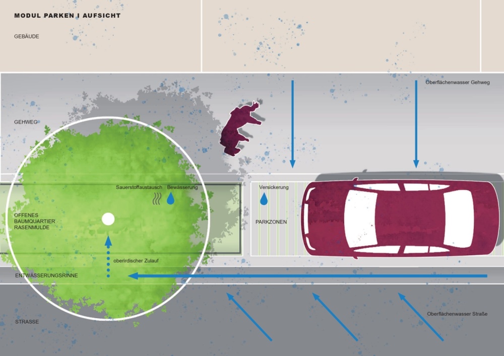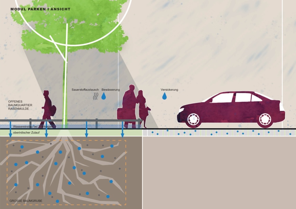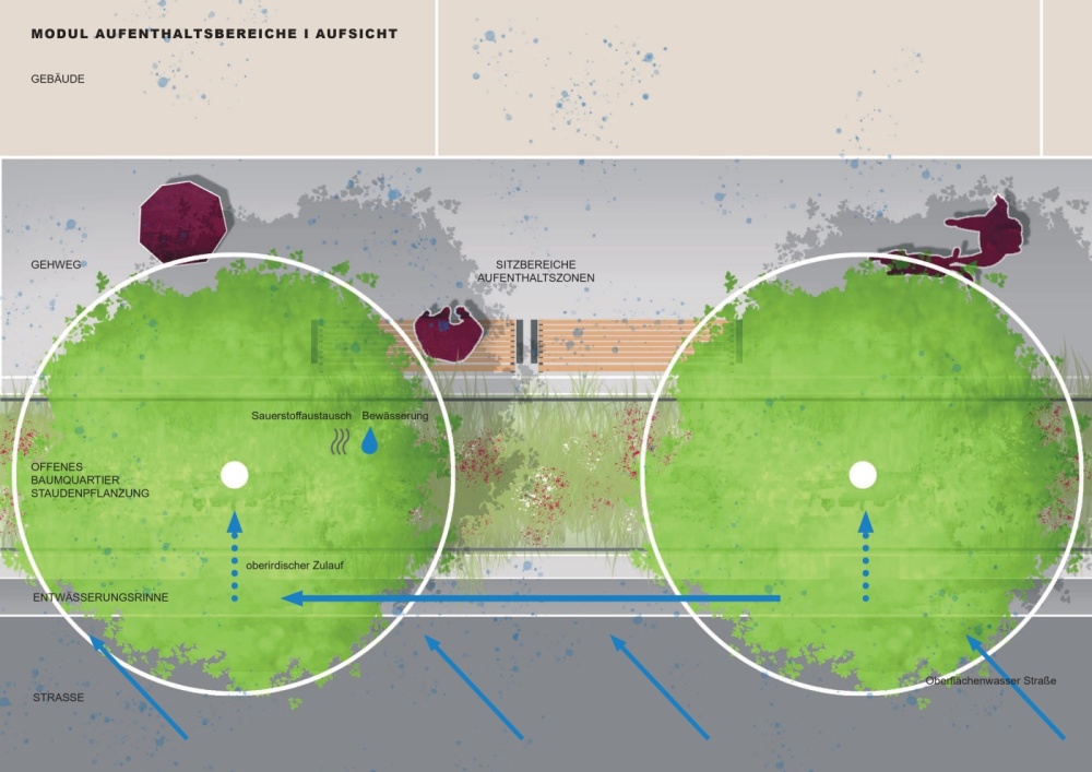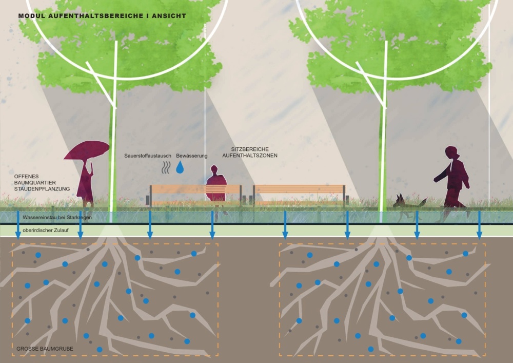 Bei der Umgestaltung des Straßenraums und den Planungen der Grünelemente achten wir daher besonders darauf, dass der Niederschlag, der sich auf Gehwegen und im Straßenbereich sammelt, nicht über Rinnen und Abläufe in den Kanal geführt, sondern direkt in die Baumscheiben und Beete eingeleitet wird.