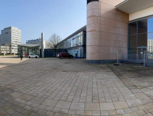 Die Anlieferung des Erweiterungsneubaus erfolgt ebenerdig über die Hafenstraße.. Besucherinnen und Besucher, die ihr Auto im Parkhaus der Congresshalle parken, können über einen neuen Zugang weiterhin problemlos direkt in den Neubau oder in das Bestandsgebäude gelangen.