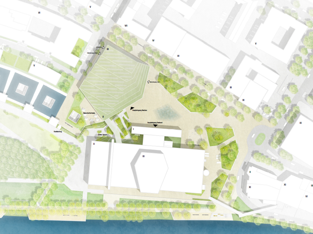Wesentlicher planerischer Bestandteil ist die Überlegung, den Erweiterungsneubau mit der Congresshalle auf Stadtniveau ebenerdig zu verbinden und gleichzeitig die Zuwegung vom Johannes-Hoffmann-Platz zum Hafeninselpark städtebaulich zu öffnen.