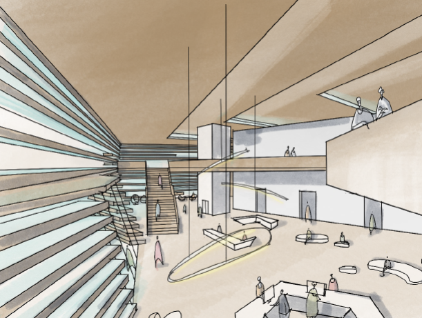 - Im Erdgeschoss des Erweiterungsneubaus einen großen und kleinen Saal mit direkter Anbindung an eine multifunktionale Ausstellungsfläche einrichten