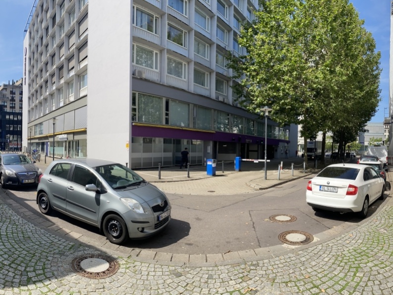 Vor dem Eingang zum „Haus Berlin“ befinden sich zwei Behindertenstellplätze. Entlang der nördlichen Grundstücksgrenze gliedert eine erhaltenswerte Baumreihe den Straßenraum und wertet diesen auf.