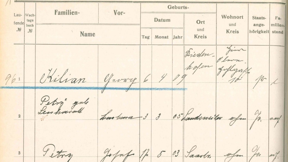 Im Bestand des Stadtarchivs Saarbrücken finden sich unter der Signatur Pi-1 bis Pi-6 sechs Haftbücher der Zentralwache der Saarbrücker Polizei. Diese befand sich ausweislich des Adressbuchs Am Schlossplatz 2. Die Haftbücher umfassen lückenlos den Zeitraum vom 10.04.1929 bis 03.06.1938. Das Format der Bände ist 41 x 26 cm (HxB). Die Bände sind eine aussagekräftige Quelle für eine krisenreiche Zeit mit der Saarabstimmung 1935 und der Rückgliederung an Hitler-Deutschland mit Verfolgungsmaßnahmen gegen Juden, Sozialdemokraten und zahlreichen anderen Gruppen.