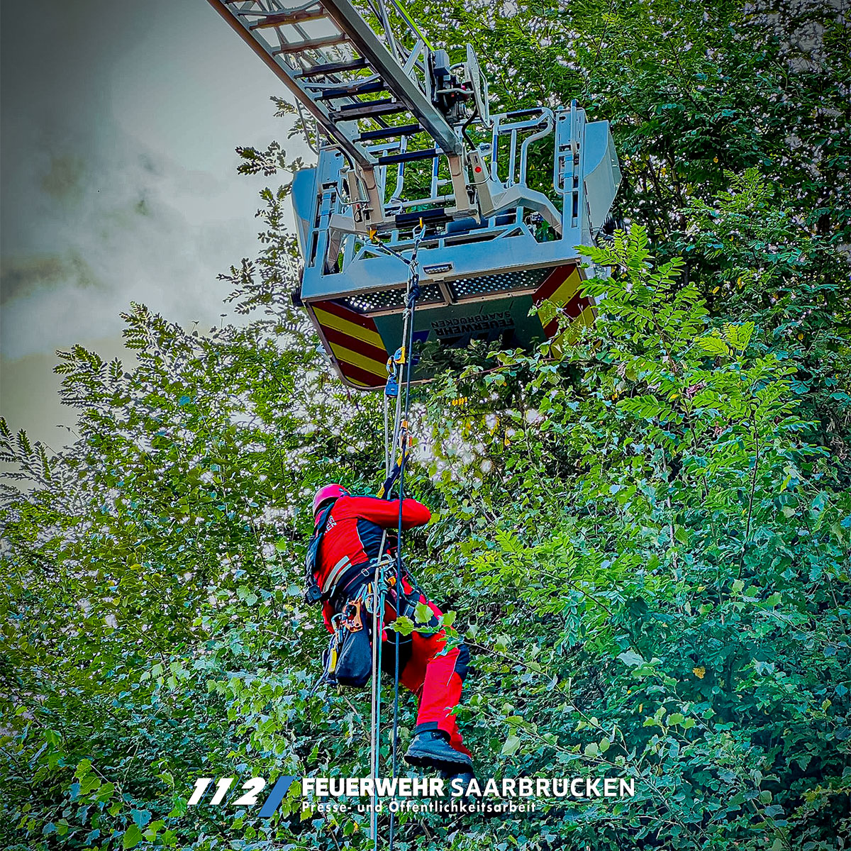 Die Zwangslage der Katze befand sich in circa acht Metern Höhe im Hang. Eine einfache, für unsere Einsatzkräfte sichere Rettung, war so nicht gegeben. Der Einsatzleiter entschied sich die Höhenrettung einzusetzen.