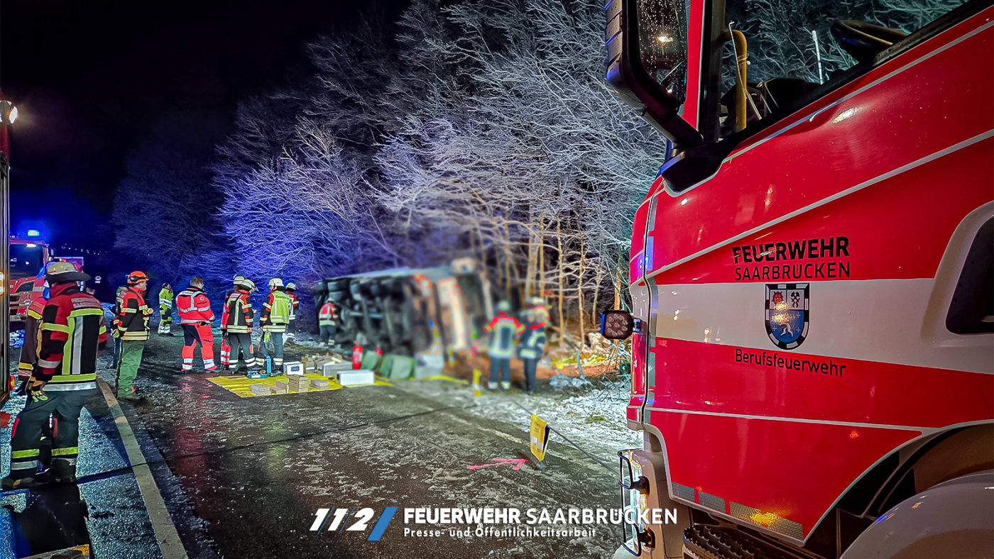 Beim Eintreffen der Rettungskräfte lag bei schneebedeckter Fahrbahn ein LKW eines Entsorgungsbetriebes auf der Fahrerseite im Straßengraben. Weitere Fahrzeuge waren nicht beteiligt.