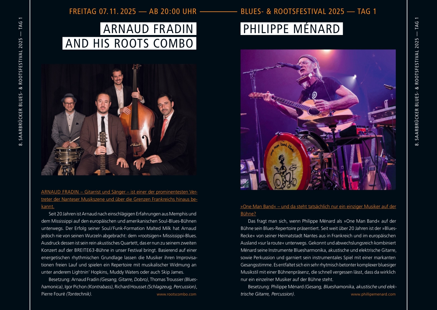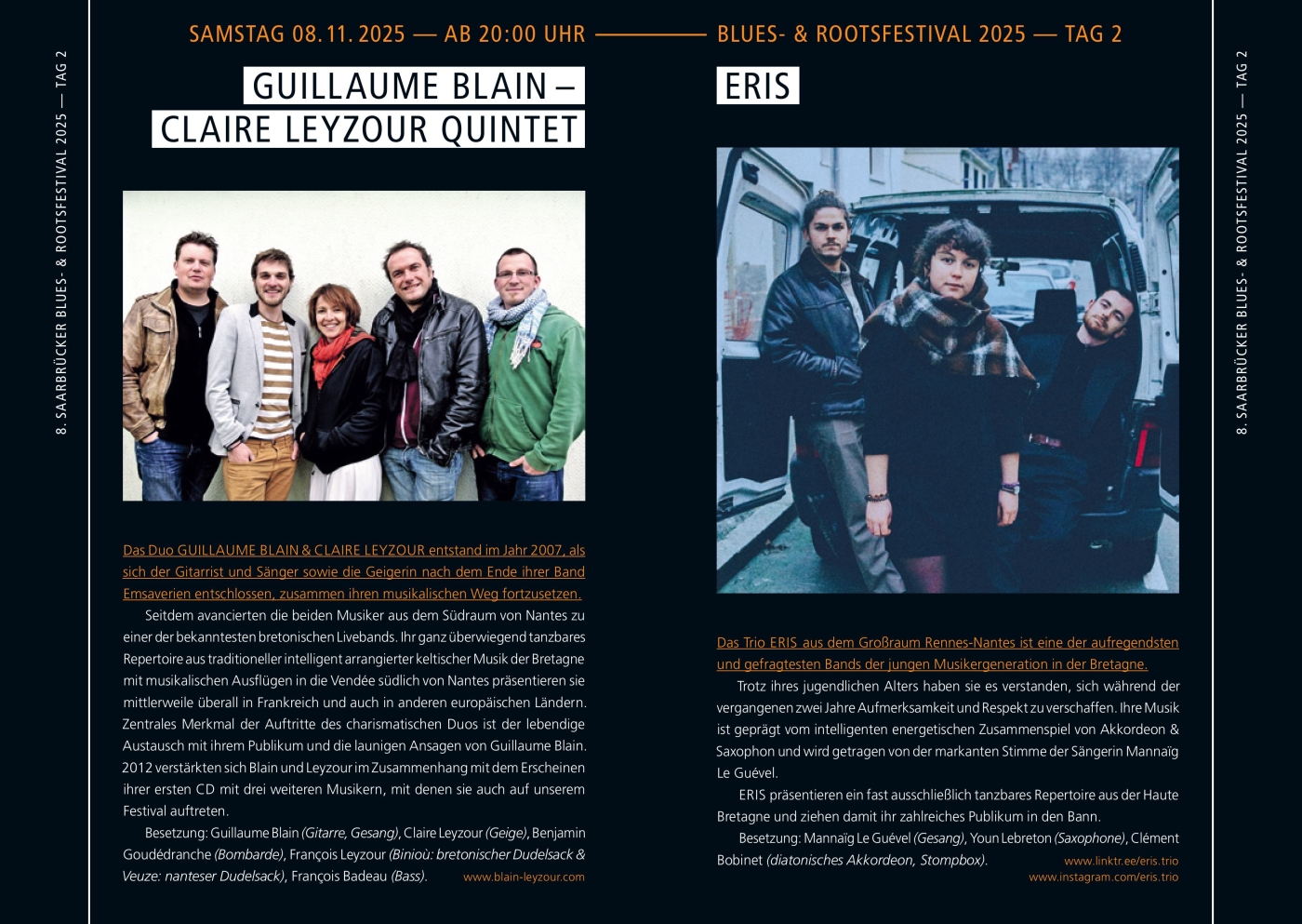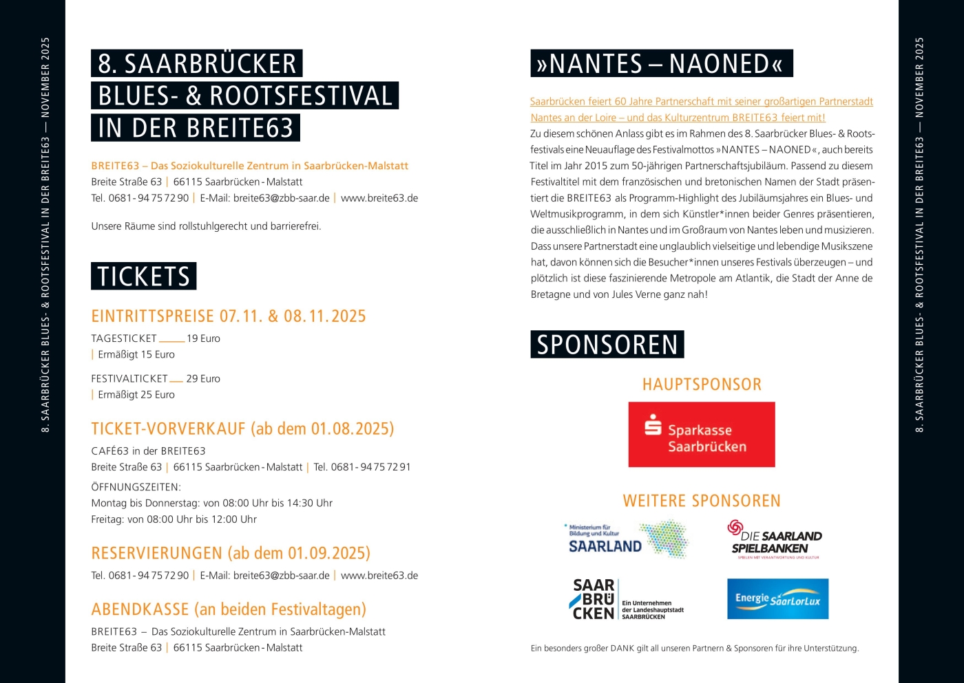 Zu diesem schönen Anlass gibt es im Rahmen des 8. Saarbrücker Blues- & Rootsfestivals eine Neuauflage des Festivalmottos »NANTES – NAONED«, auch bereits Titel im Jahr 2015 zum 50-jährigen Partnerschaftsjubiläum. Passend zu diesem Festivaltitel mit dem französischen und bretonischen Namen der Stadt präsentiert die BREITE63 als Programm-Highlight des Jubiläumsjahres ein Blues- und Weltmusikprogramm, in dem sich Künstler*innen beider Genres präsentieren, die ausschließlich in Nantes und im Großraum von Nantes leben und musizieren. Dass unsere Partnerstadt eine unglaublich vielseitige und lebendige Musikszene hat, davon können sich die Besucher*innen unseres Festivals überzeugen – und plötzlich ist diese faszinierende Metropole am Atlantik, die Stadt der Anne de Bretagne und von Jules Verne ganz nah!