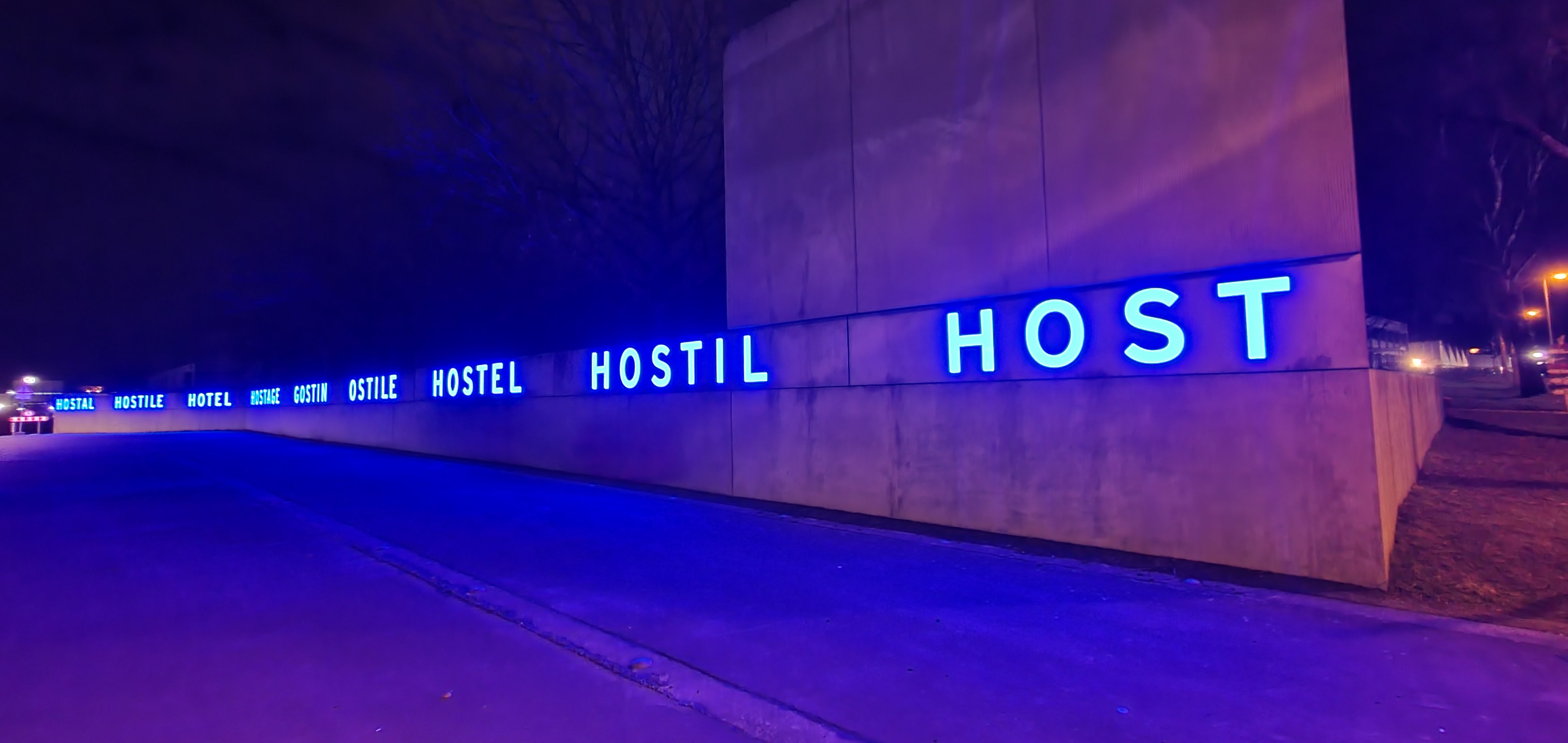 Die insgesamt 53 Buchstaben befinden sich an einer Mauer aus grauem Sichtbeton auf der Seite, die zur Metzer Straße hin liegt. Sie leuchten bei Dunkelheit blau und formen in mehreren Sprachen die Wörter „HOSTAL HOSTILE HOTEL HOSTAGE GOSTIN OSTILE HOSTEL HOSTIL HOST (Gasthaus - feindlich - Hotel - Geisel - Herberge), die auf die wechselvolle Geschichte des Ortes im Laufe der Zeit hinweisen.
