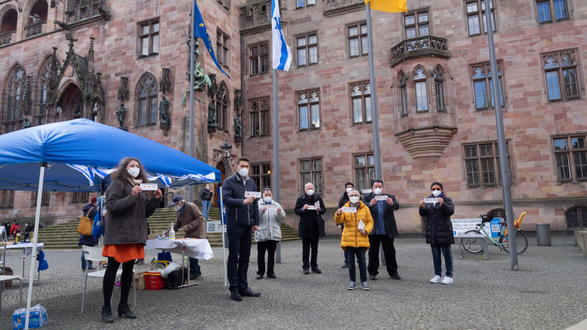 Oberbürgermeister Uwe Conradt hat am Donnerstag, 15. April, die Synagogengemeinde Saar an ihrem Infostand vor dem Rathaus St. Johann besucht.