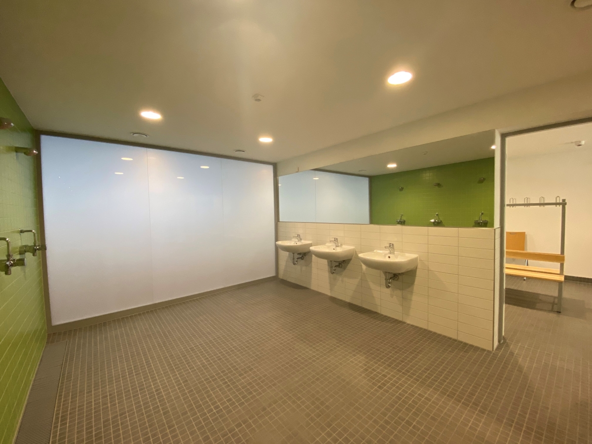 Im Unter- und Kellergeschoss gibt es jetzt modernisierte Dusch-, Sanitär- und Lagerräume. Des Weiteren hat die Stadt eine rollstuhlgerechte Umkleide mit Toiletten-Einheit eingebaut und die Flurverglasungen, Innentüren, Boden-, Decken- und Wandbekleidungen sowie die Beleuchtung erneuert. Abschließend wurde eine neue Aufzuganlage eingebaut.