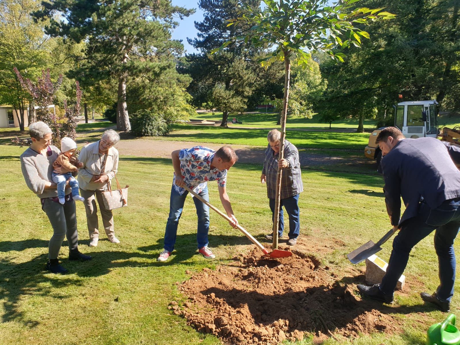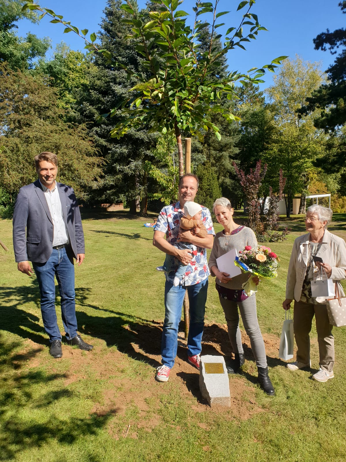 Oberbürgermeister Uwe Conradt hat gemeinsam mit den Eltern Beate und Andreas Hemmer am Donnerstag, 23. September, im Deutsch-Französischen Garten (DFG) ein Kirschbäumchen für das erste Saarbrücker Neugeborene des Jahres 2021 gepflanzt.