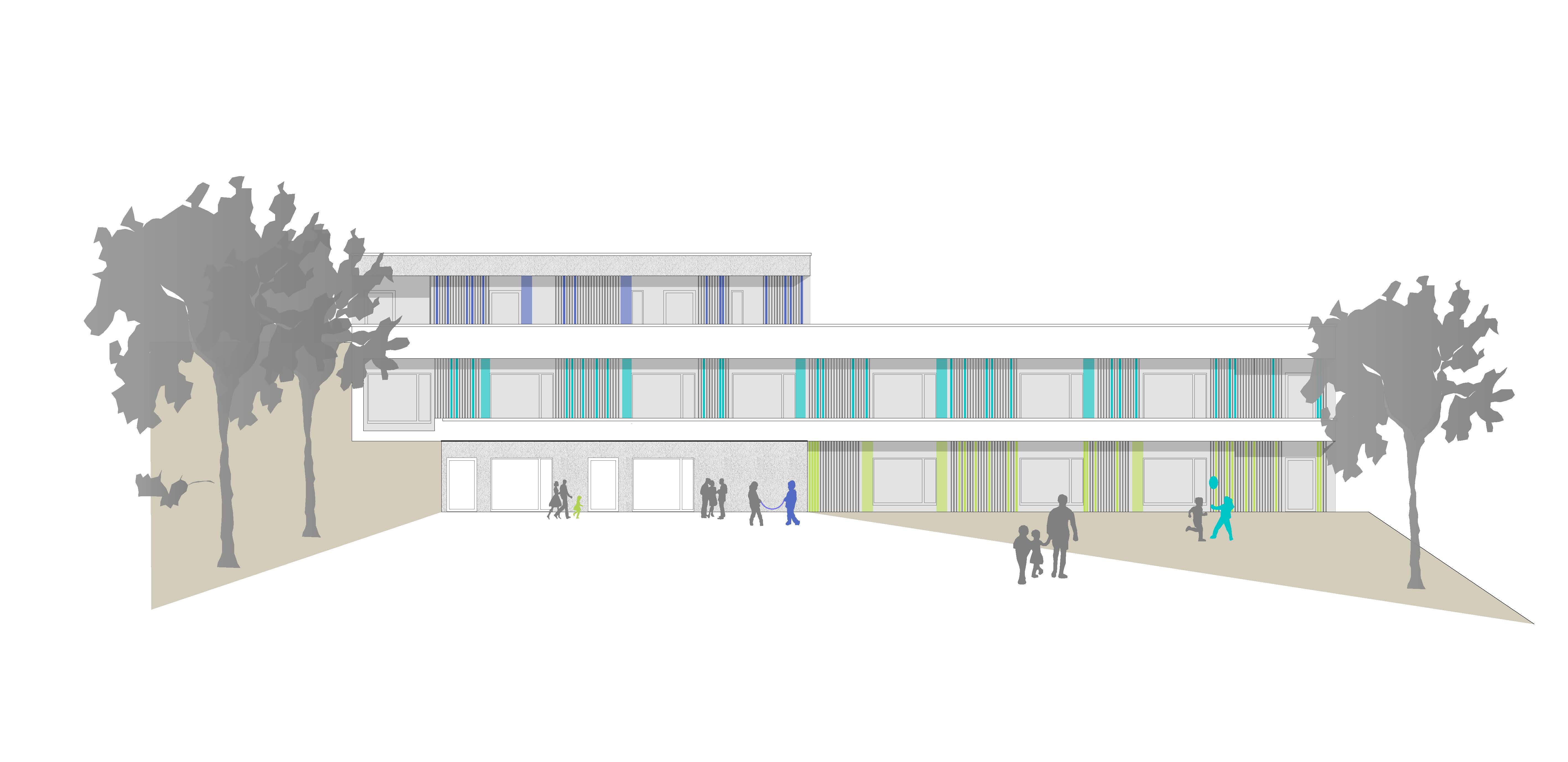 Im vorderen Bereich der Kita werden entlang der Schlachthofstraße zehn Stellplätze angelegt. Eine barrierefrei gestaltete Querungshilfe vor dem Eingang soll ein sichereres Überqueren der Straße ermöglichen. Zusätzlich werden im vorderen Bereich der Kita Fahrradständer und Sitzelemente angebracht sowie drei Bäume gepflanzt.