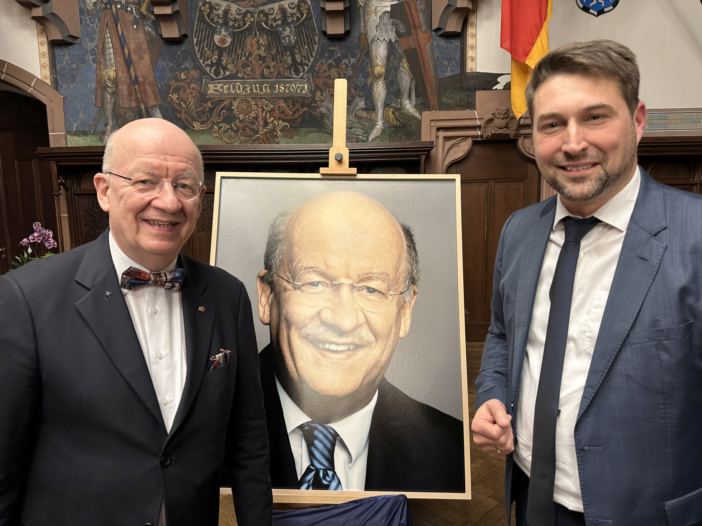OB Conradt (r.) und Professor Wahlster mit dem neuen Porträt des Ehrenbürgers - LHS