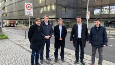 Christof Kreis, Verwaltungsdezernent Sascha Grimm, Werner Maurer, OB Conradt, Baudezernent Patrick Berberich (v.l.) beim offiziellen Start des Tempo 30-Bereichs - LHS