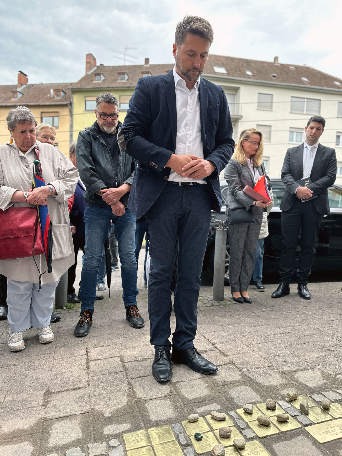 Oberbürgermeister Uwe Conradt begrüßte zu Beginn jeder Station die anwesenden Gäste und würdigte die Opfer des Nationalsozialismus, zu deren Andenken Stolpersteine verlegt wurden. „An die Opfer zu erinnern, ist ein Ausdruck von Anstand und Menschlichkeit. Durch die Stolpersteine wird diese Erinnerung in den Alltag geholt. Sie sollen zum Innehalten und Nachdenken anregen. Stolpersteine sind keine Grabsteine, aber sie machen Opfer mit ihrem Namen sichtbar und regen dazu an, Fragen zu stellen nach den Schicksalen, die hinter diesen Namen stehen. Mit den neuen Stolpersteinen ergänzen wir die Erinnerungskultur in Saarbrücken weiter.“