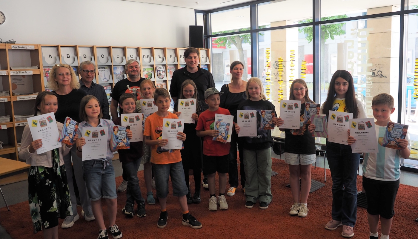 Regionalentscheid des Lesedino-Vorlesewettbewerbs 2023 (hintere Reihe v.l.n.r.: Bildungsdezernentin Dr. Sabine Dengel, Rolf Strauß (Ministerium für Bildung und Kultur), Igor Holland-Moritz (Europäische Kinder- und Jugendbuchmesse Saarbrücken), Philipp Braun (Stadtbibliothek Saarbrücken) und Katrin Armbrust (Friedrich Bödecker Kreis Saarland e.V.); vordere Reihe: Teilnehmerinnen und Teilnehmer des RegionalentscheidsDownload