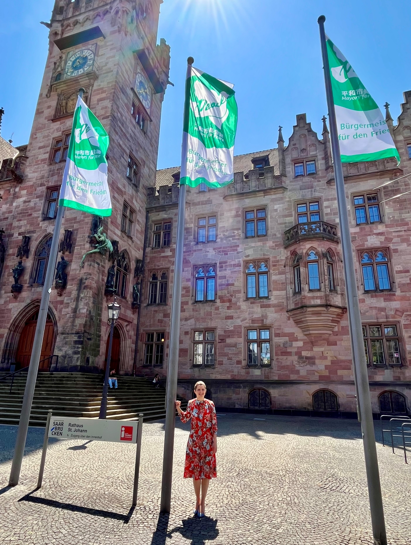 In Anwesenheit von Bürgermeisterin Barbara Meyer wurde dazu die „Mayors for Peace“-Flagge vor dem Saarbrücker Rathaus gehisst.