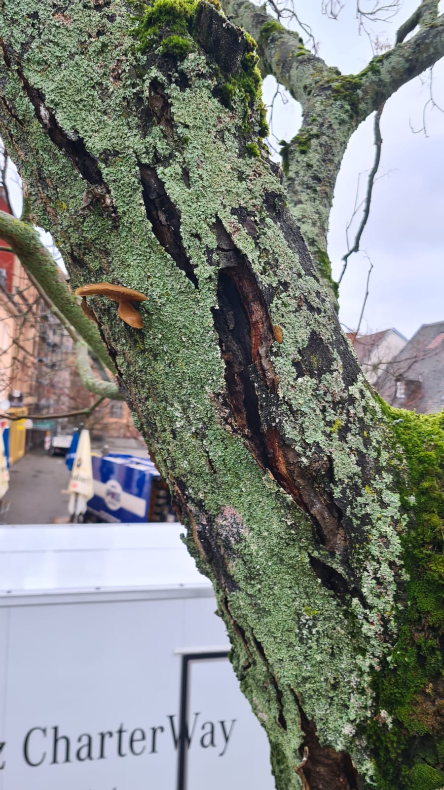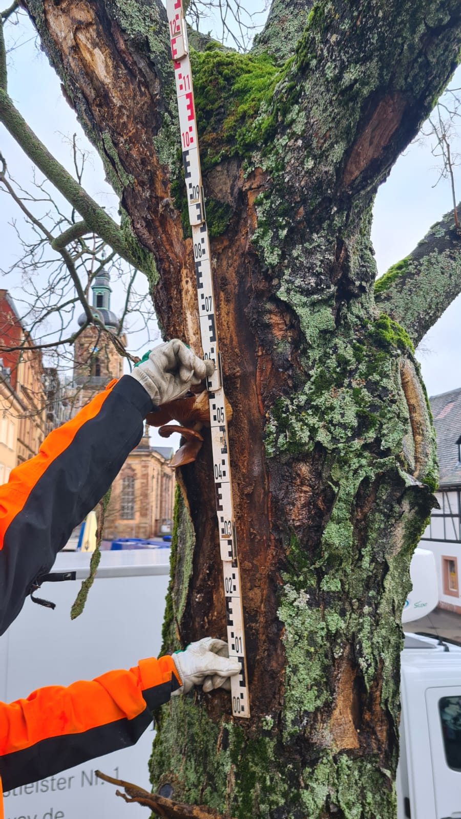 Neben den anspruchsvollen Standortbedingungen in der Stadt, haben Anfahrschäden am Stamm und ein massiver Befall mit holzzersetzenden Pilzen dem Baum erheblich zugesetzt. Deswegen hat die Landeshauptstadt entschieden, den Baum aus Sicherheitsgründen zu fällen.