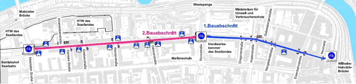 Der zweite Bauabschnitt verlängert den bereits bestehenden Teil der Fahrradstraße um weitere 750 Meter von der Roonstraße bis zur Malstatter Straße.