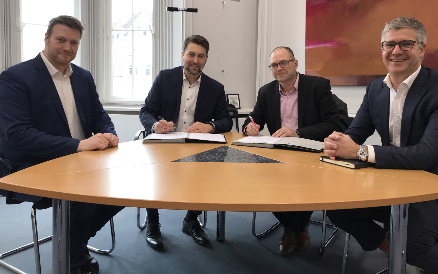 Digitalisierungsdezernent Tobias Raab und OB Conradt mit Martin Stiebitz und Thomas Lauterbach von der Deutschen Telekom (v.l.n.r.) - LHS