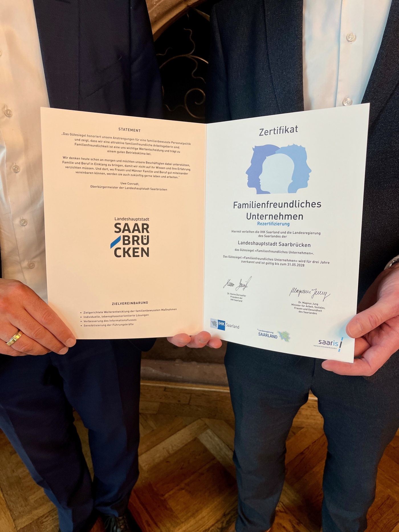 Die saarland.innovation&standort e.V. (saaris) hat der Landeshauptstadt Saarbrücken am Dienstag, 6. Mai, erneut das Gütesiegel „Familienfreundliches Unternehmen“ verliehen.