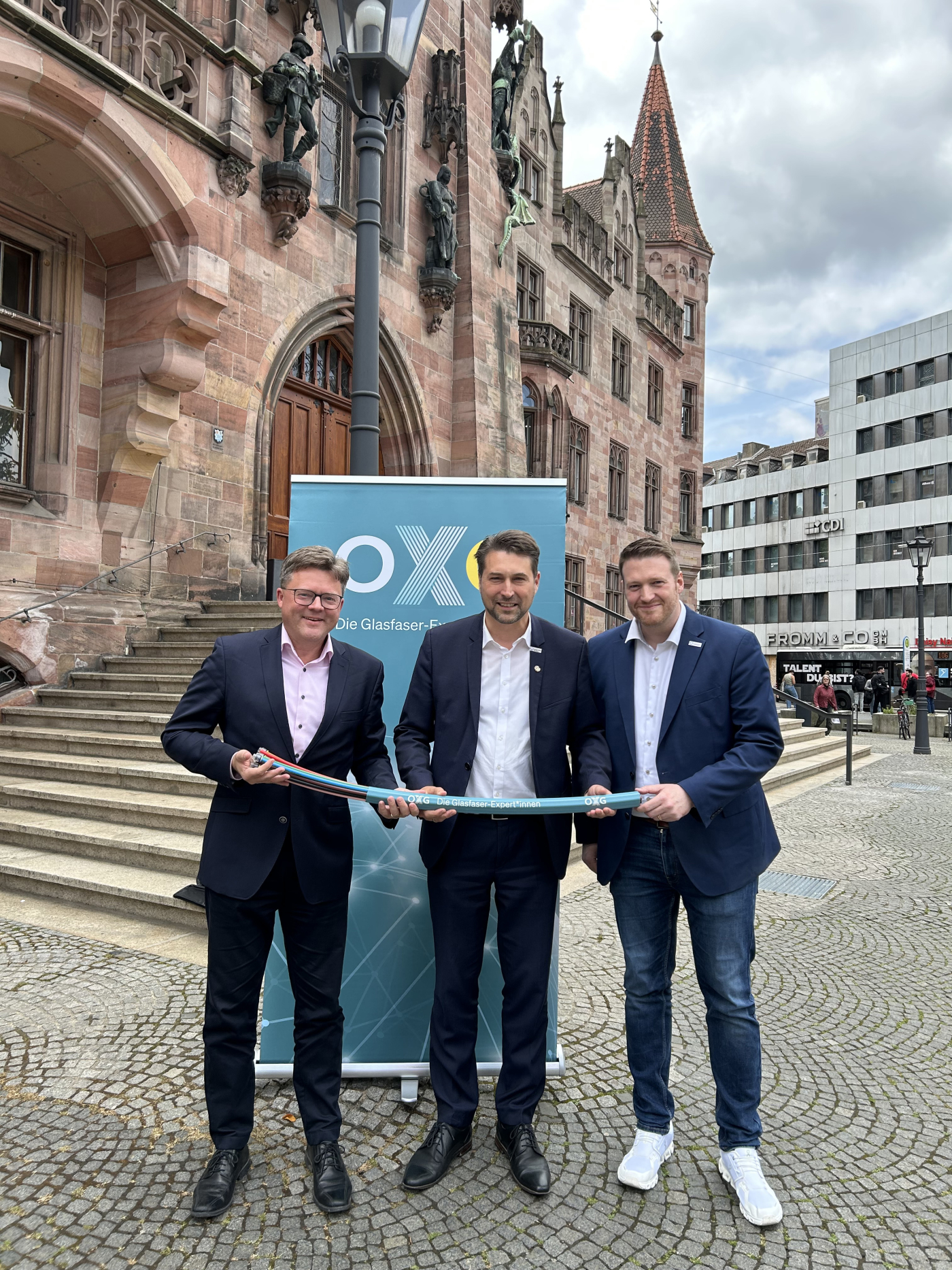 Oberbürgermeister Uwe Conradt, Tobias Raab, Dezernent für Wirtschaft, Soziales und Digitalisierung, und Dr. Sören Trebst, Geschäftsführer von OXG, haben am Montag, 26. Mai, einen Letter of Intent zum weiteren Glasfaserausbau in Saarbrücken unterzeichnet.