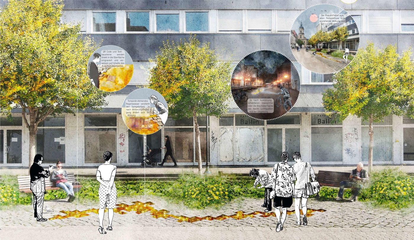 „Der Entwurf integriert bewusst den bestehenden städtebaulichen Kontext und greift dabei auf ortsspezifische Elemente zurück, wie die markante Pflastergestaltung des Künstlers Paul Schneider und die prägnanten, sich im Herbst goldfärbenden Gingko-biloba-Bäume“, sagt Julia Treichel. Aus diesem Pflaster werden einzelne Steine entnommen, so dass ein Riss entsteht, der sinnbildlich für die erlittene Diskriminierung steht und nach dem Prinzip der traditionellen japanischen Reparaturmethode Kintsugi mit einer goldfarbenen Masse gefüllt wird.