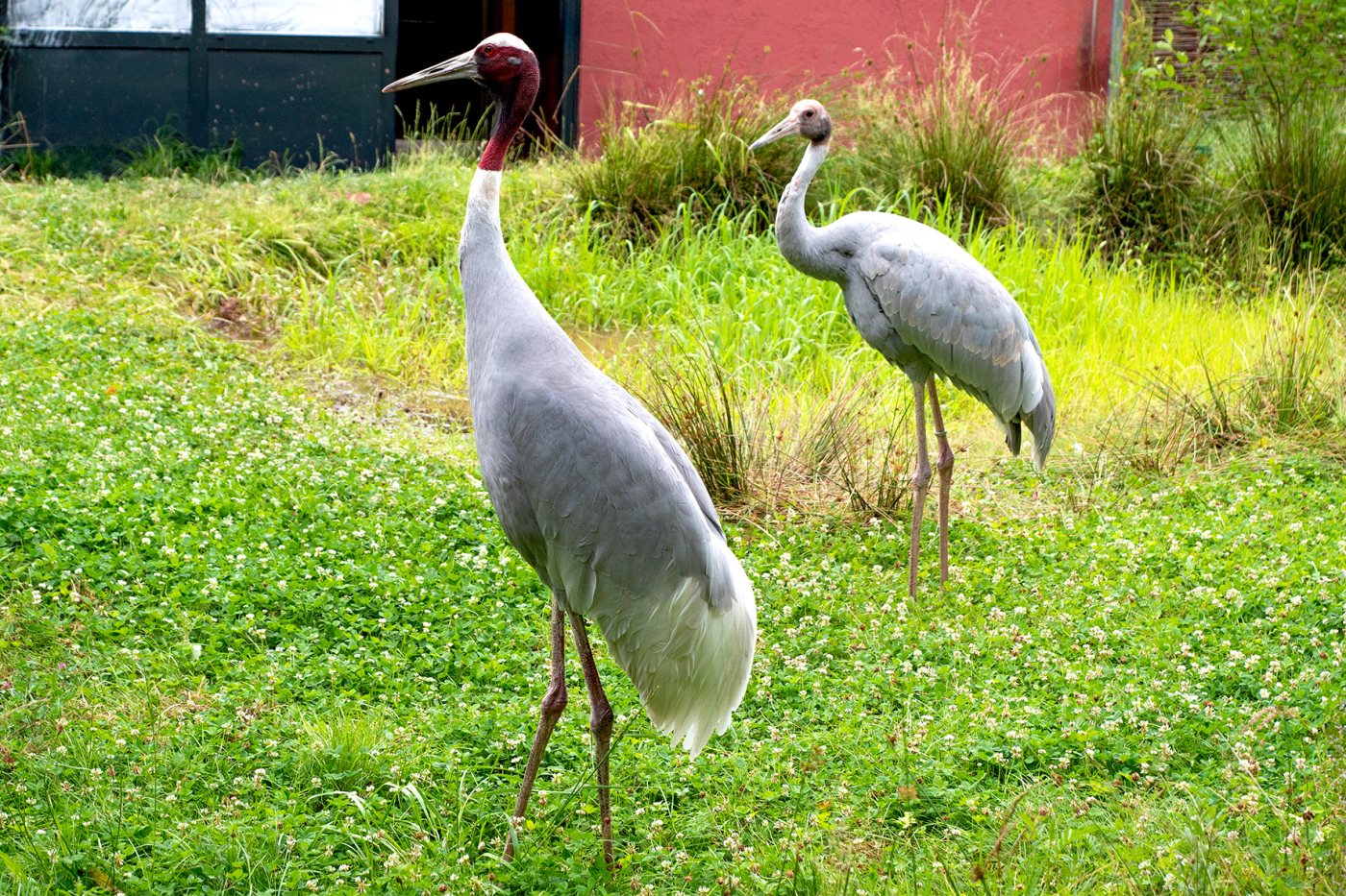 Die Saruskraniche haben den Transport gut überstanden und zeigten von Anfang an gegenseitiges Interesse. Sie erkunden gemeinsam ihr Gehege und gewöhnen sich schrittweise aneinander.