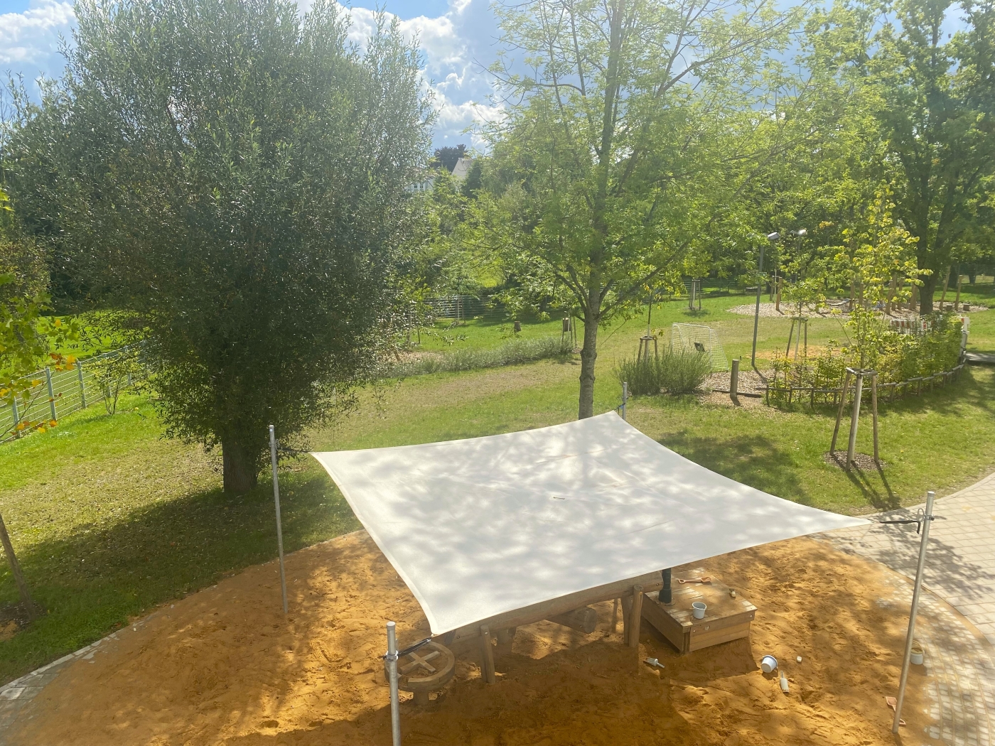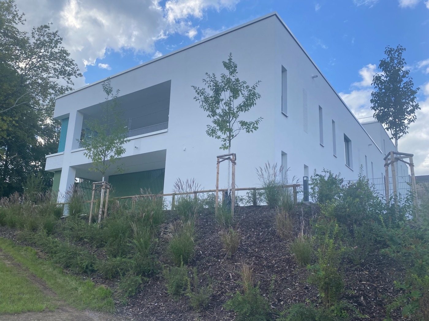Die Außenanlage ist in unterschiedliche Bewegungs- und Spielzonen aufgeteilt, die der altersgerechten Belegung der angrenzenden Gruppenräume entsprechen. Alle Gruppen haben direkte Zugänge zum Außenspielgelände.