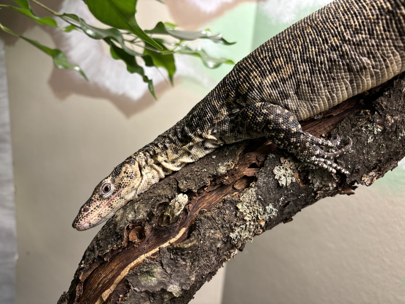 Die beiden Warane haben sich gut eingelebt. Anfangs noch sehr scheu, zeigen sie sich immer häufiger den Besucherinnen und Besuchern in ihrem Terrarium. Auffällig ist ihr schlanker Körperbau: Von der Gesamtlänge von bis zu 70 Zentimetern entfällt ein Großteil auf den Schwanz, der länger ist als der restliche Körper.
