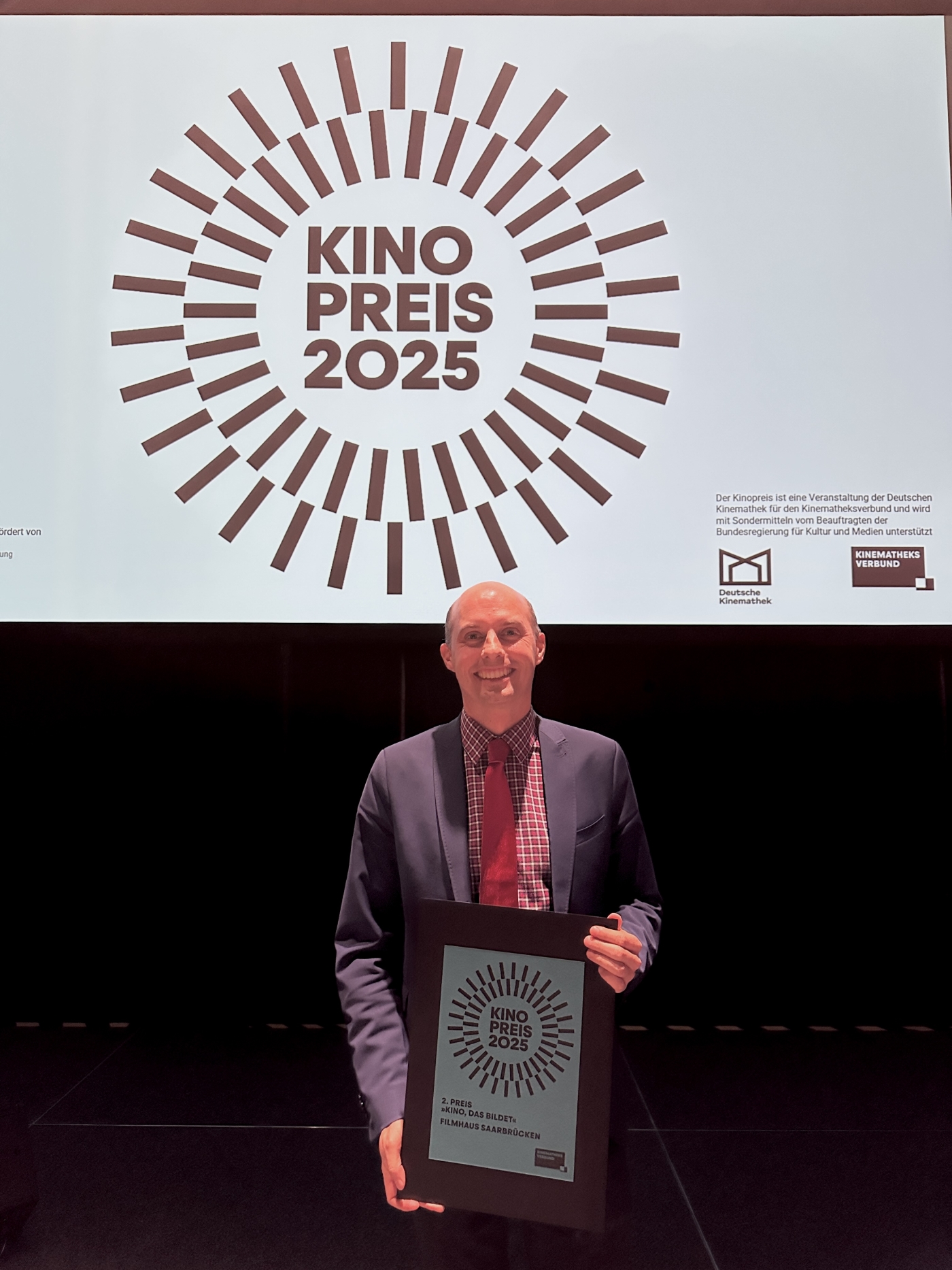 Der Leiter des Filmhauses, Dr. Nils Daniel Peiler, nahm den Preis bei der Verleihung in Berlin in der Kinemathek-Halle am Samstag, 25. Oktober, persönlich entgegen. An dem Abend zeichnete der Kinematheksverbund 20 Kinos in vier Kategorien aus und vergab Preisgelder in Höhe von insgesamt 30.000 Euro.