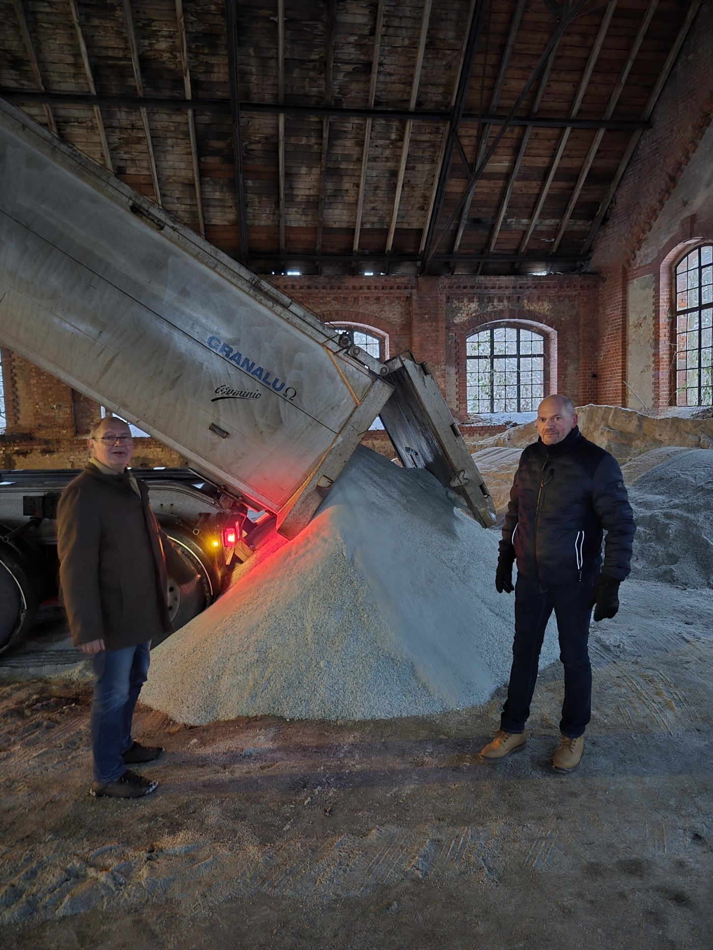 Der Bürgermeister von St. Avold René Steiner (l.) und sein Stellvertreter in Umweltfragen Pascal Helfenstein mit der Salzlieferung - Gemeinde St. Avold