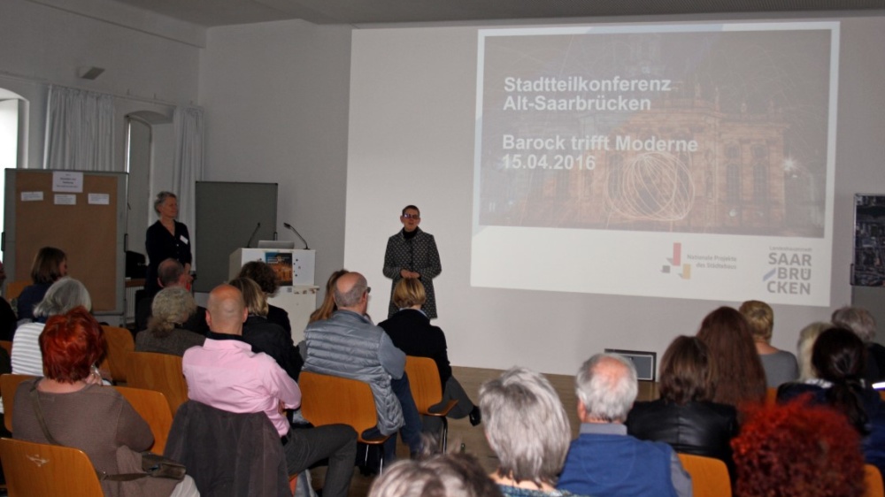 Die erste Stadtteilkonferenz zum Projekt "Barock trifft Moderne" fand Mitte April 2016 in den Räumen der HbK Saar in der Keplerstraße statt. In einem kurzen Rundgang über den Ludwigsplatz, die Stengelanlage und Eisenbahnstraße bis zur Friedenskirche wurde das Projekt in den Grundzügen von Mitarbeitern der Verwaltung erläutert. Anschließend konnten die rund 70 teilnehmenden Bürgerinnen und Bürger in Arbeitsgruppen erörtern,