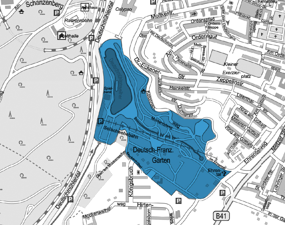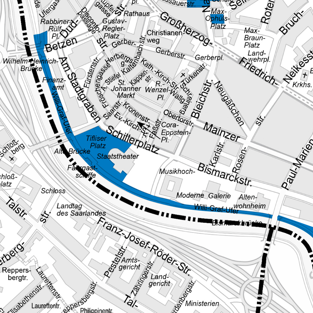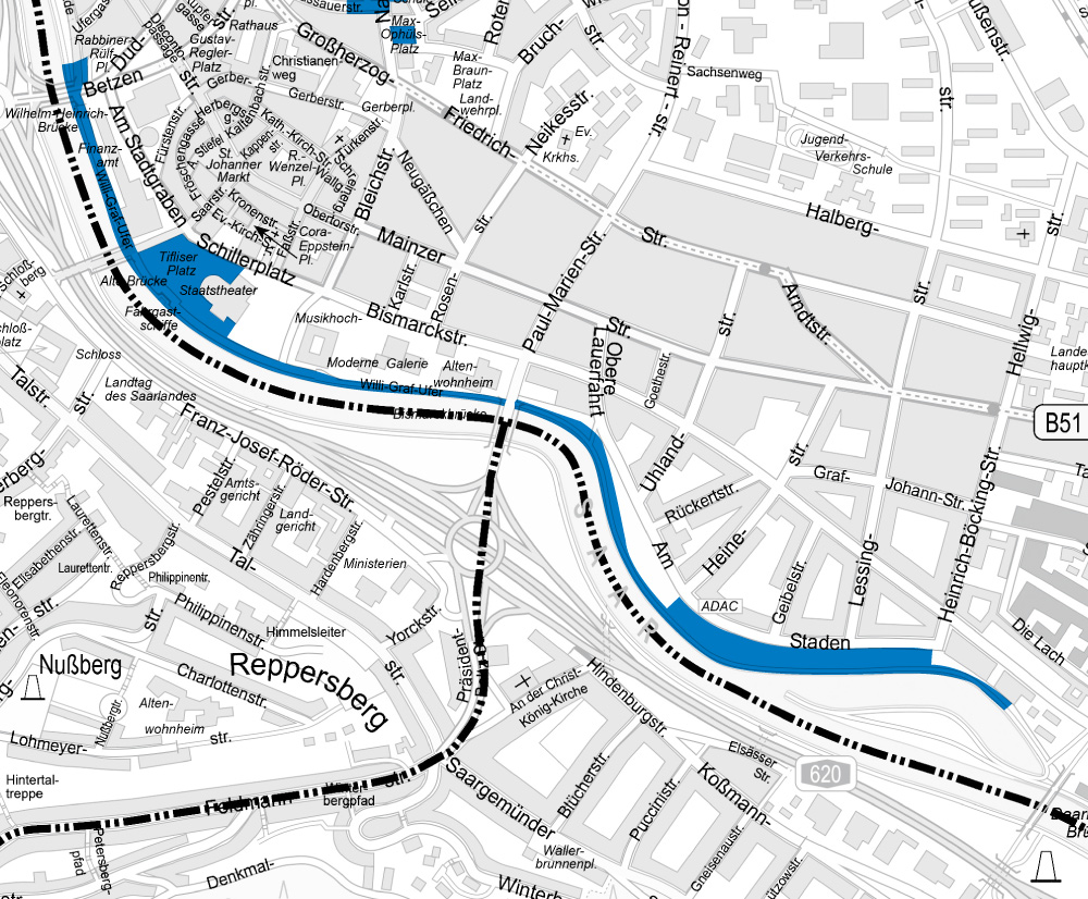 - Uferbereich und Anlagen entlang der Saar (Am Staden und Willi-Graf-Ufer) beginnend Höhe Restaurant Undine bis zur Wilhelm-Heinrich-Brücke incl. der Freitreppe Berliner Promenade. Der Regelungsbereich erfasst die Grünanlagen einschl. der dazugehörigen Wege- und Mauerflächen. Im Bereich der Straße Am Staden bis zur abknickenden Straße Obere Lauerfahrt gilt das Verbot zudem auf den uferseitig verlaufenden Bürgersteigflächen und Freiflächen einschließlich der Begrenzungsmauer zur Grünanlage hin.