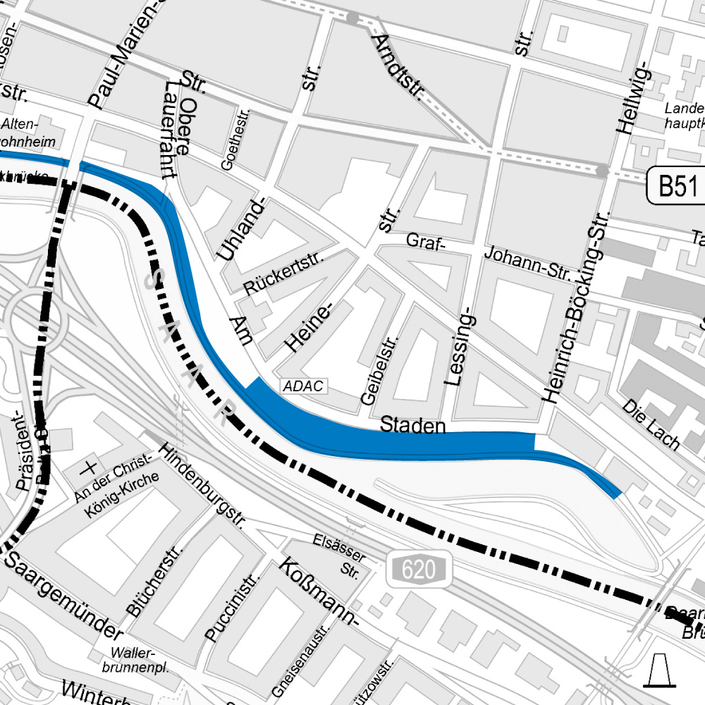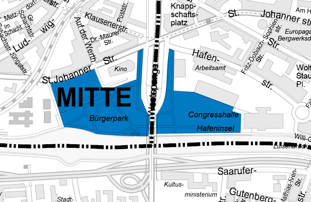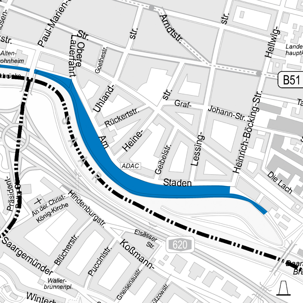 2. Uferbereich und Anlagen entlang der Saar (Am Staden und Willi-Graf-Ufer) beginnend Höhe Restaurant Undine bis zur Wilhelm-Heinrich-Brücke incl. der Freitreppe Berliner Promenade. Der Regelungsbereich erfasst die Grünanlagen einschl. der dazugehörigen Wege- und Mauerflächen. Im Bereich der Straße Am Staden bis zur abknickenden Straße Obere Lauerfahrt gilt das Verbot zudem auf den uferseitig verlaufenden Bürgersteigflächen und Freiflächen einschließlich der Begrenzungsmauer zur Grünanlage hin.