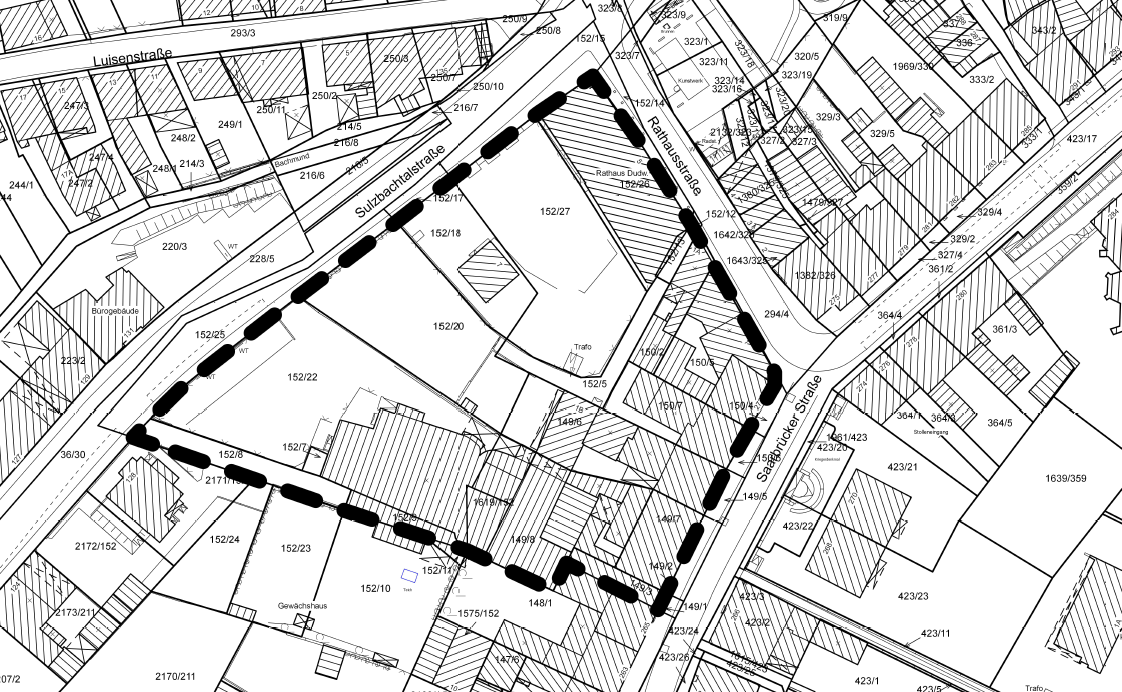 Der Geltungsbereich, der eine Fläche von rund 0,8 Hektar umfasst, wird wie folgt begrenzt: Im Nordwesten durch die Sulzbachtalstraße, im Nordosten durch die Rathausstraße, im Südosten durch die Saarbrücker Straße, im Süden durch die südliche Begrenzung des Grundstücks Saarbrücker Straße Nr. 267