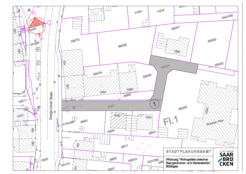 Namens der Landeshauptstadt Saarbrücken als Trägerin der Straßenbaulast widme ich hiermit gemäß § 6 des Saarländischen Straßengesetzes vom 17. Dezember 1964 in der Fassung der Bekanntmachung vom 15. Oktober 1977 (Amtsbl. S. 969), zuletzt geändert durch Artikel 6 Abs. 8 Verwaltungsstrukturreformgesetz vom 21. November 2007 (Amtsbl. S. 2393) die Flächen des Bebauungsplanes Nr. 481.15.00 „Wohngebiet zwischen Saargemünder Straße und Gartenstraße“ in der Gemarkung Bübingen, Flur 1, Flurstücks-Nrn. 390/24 und 399/7 (im Lageplan grau hinterlegt)