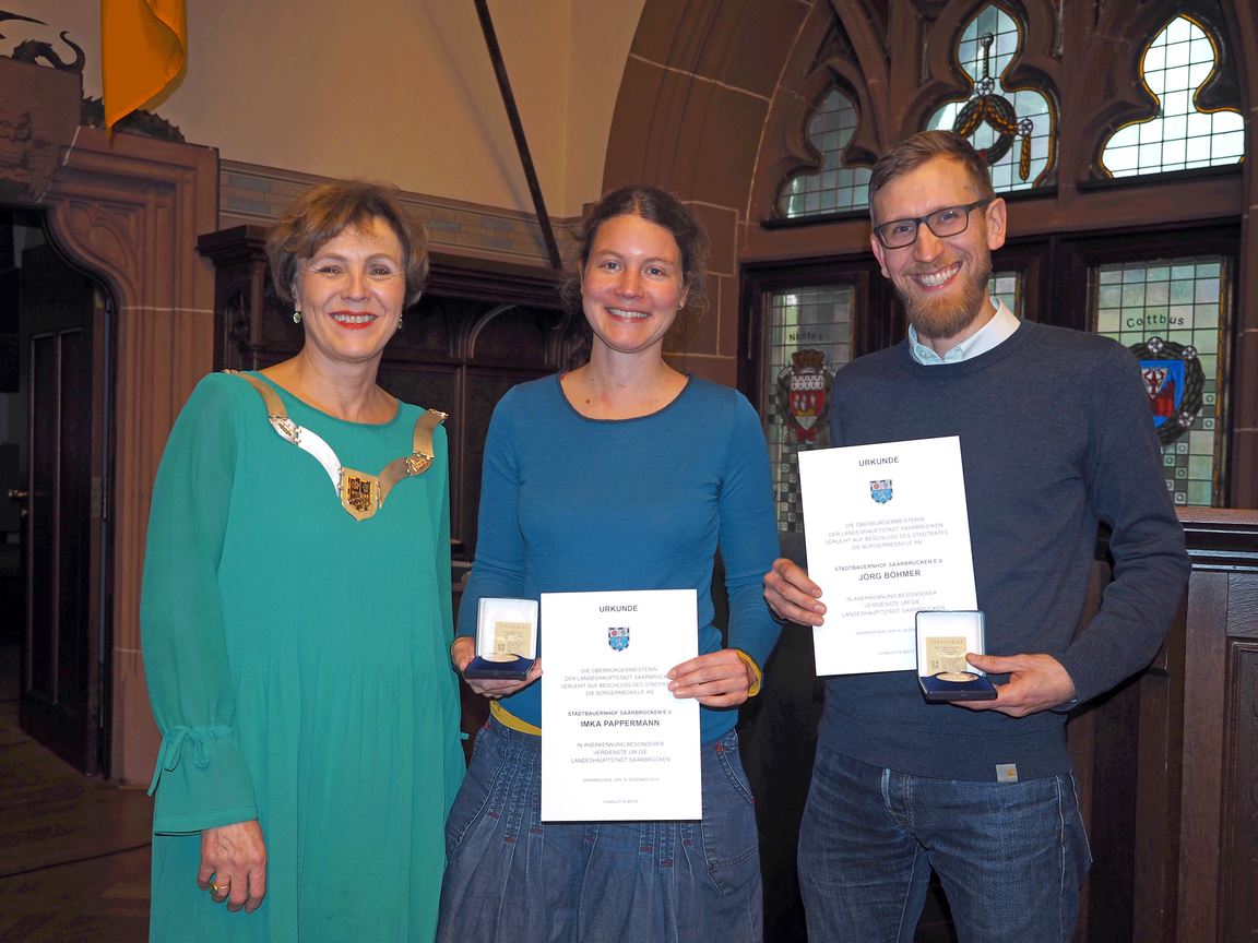 Seit 2015 pachtet der Stadtbauernhof Saarbrücken e.V. einen ehemaligen Aussiedlerhof im beliebten Naherholungsgebiet Almet in St. Arnual. Ziel des Vereins ist die Schaffung von Bildungsangeboten für eine nachhaltige Entwicklung, wobei ein Fokus auf der nachhaltigen Erzeugung von Nahrungsmitteln liegt. Jörg Böhmer und Imka Pappermann haben gemeinsam den ersten Schritt getan, um dieses Projekt zu starten, zugleich sind sie Pächter des landwirtschaftlichen Betriebes auf dem Stadtbauernhof. Jörg Böhmer und Imka Pappermann bekommen stellvertretend für die Initiative „Stadtbauernhof Saarbrücken e.V.“ die Bürgermedaille verliehen.